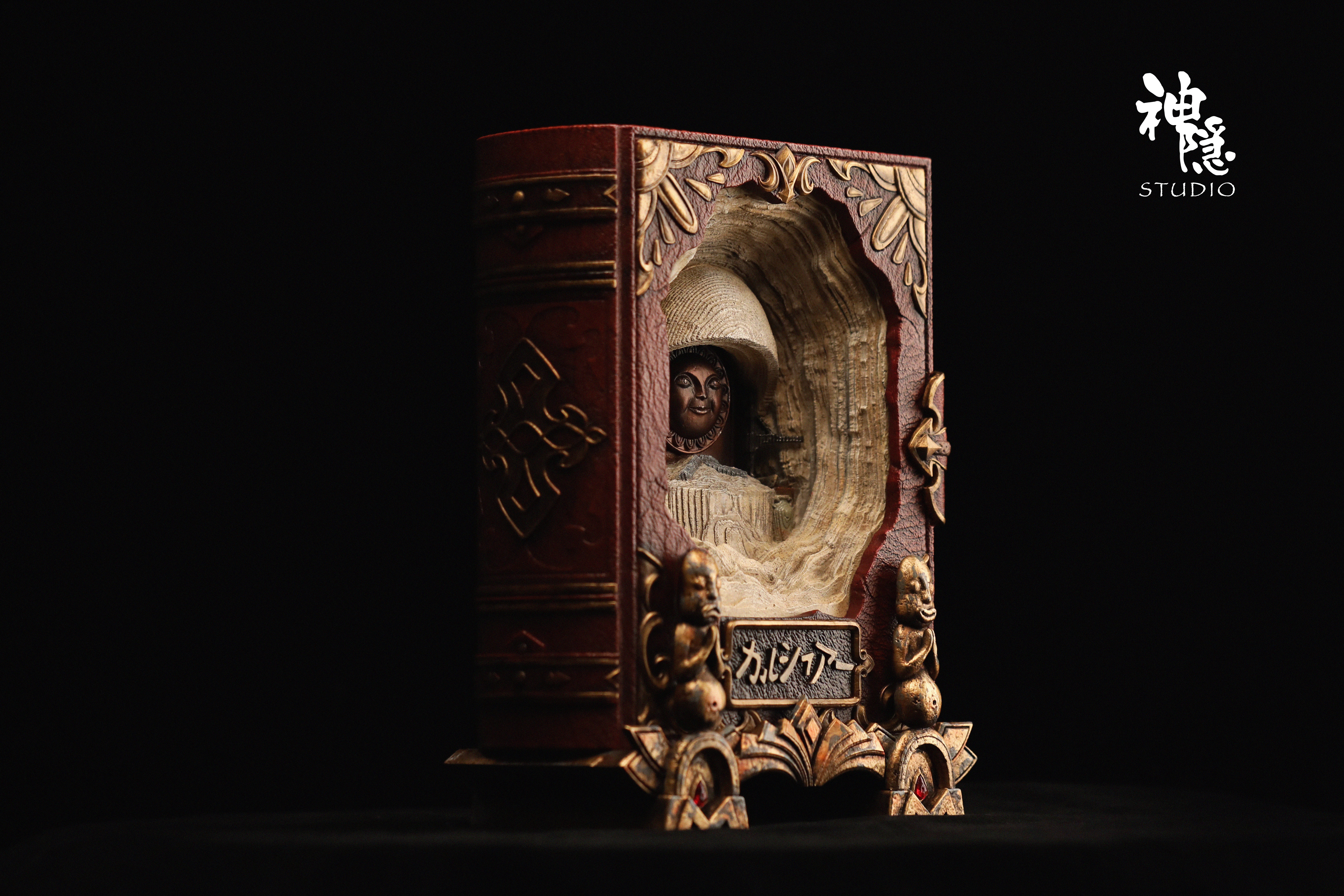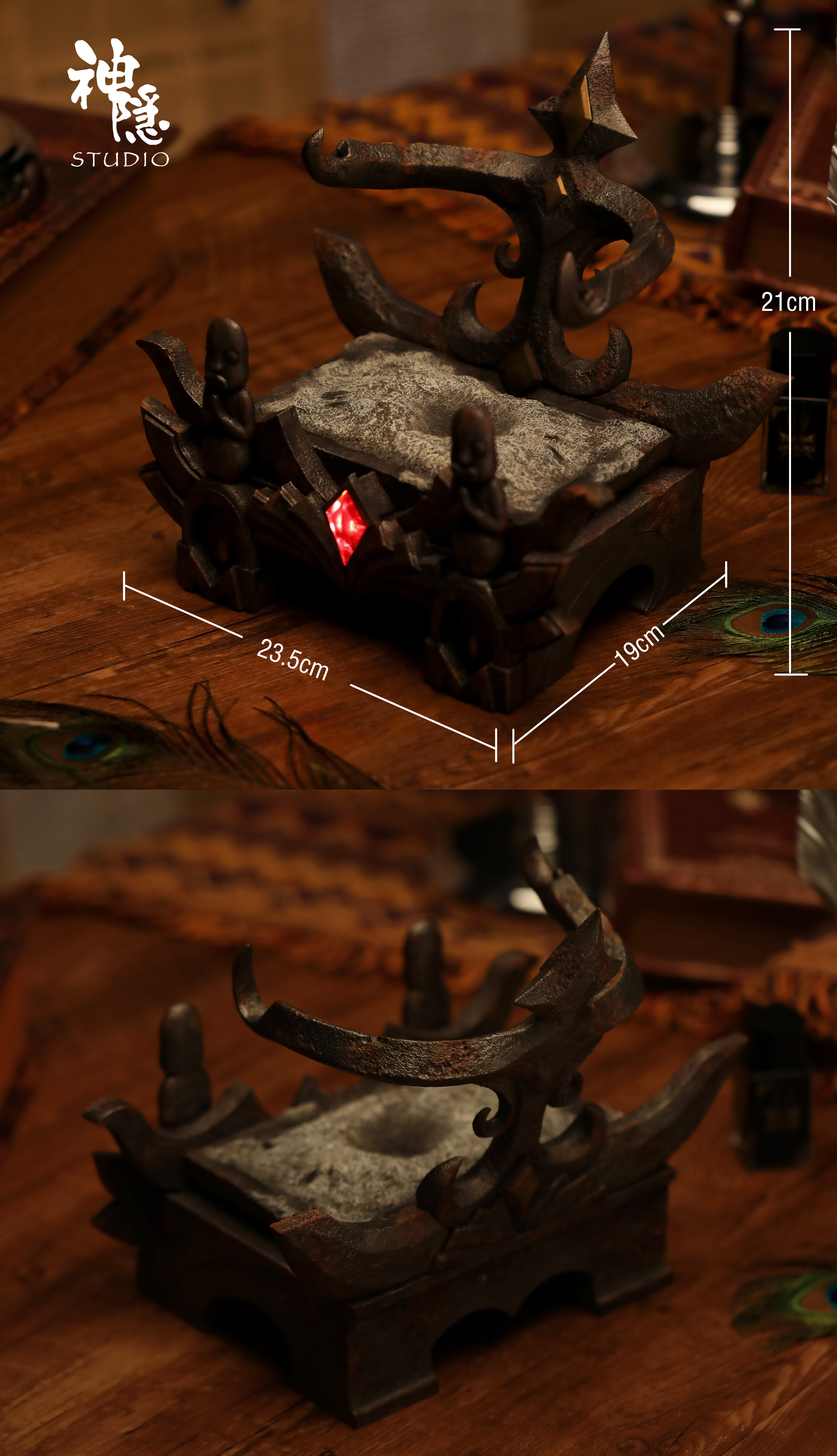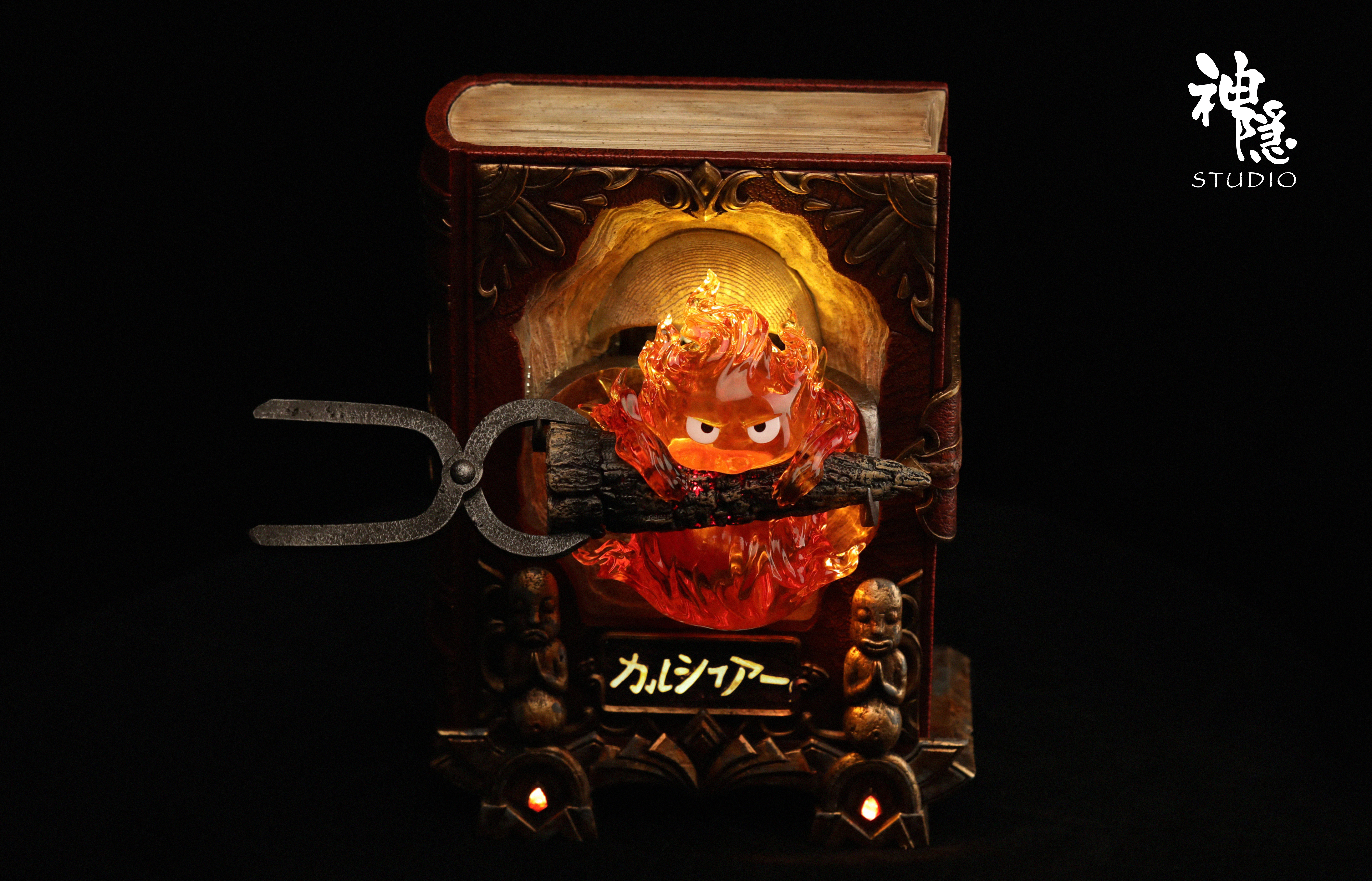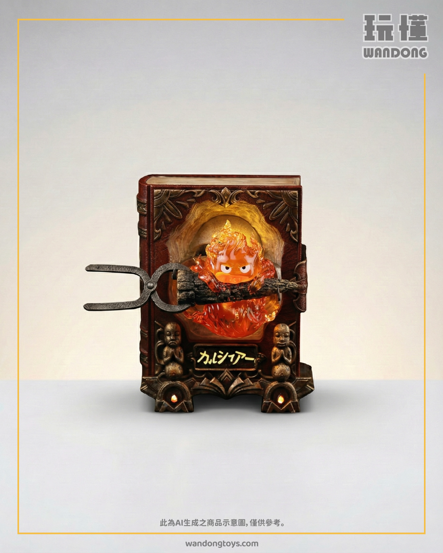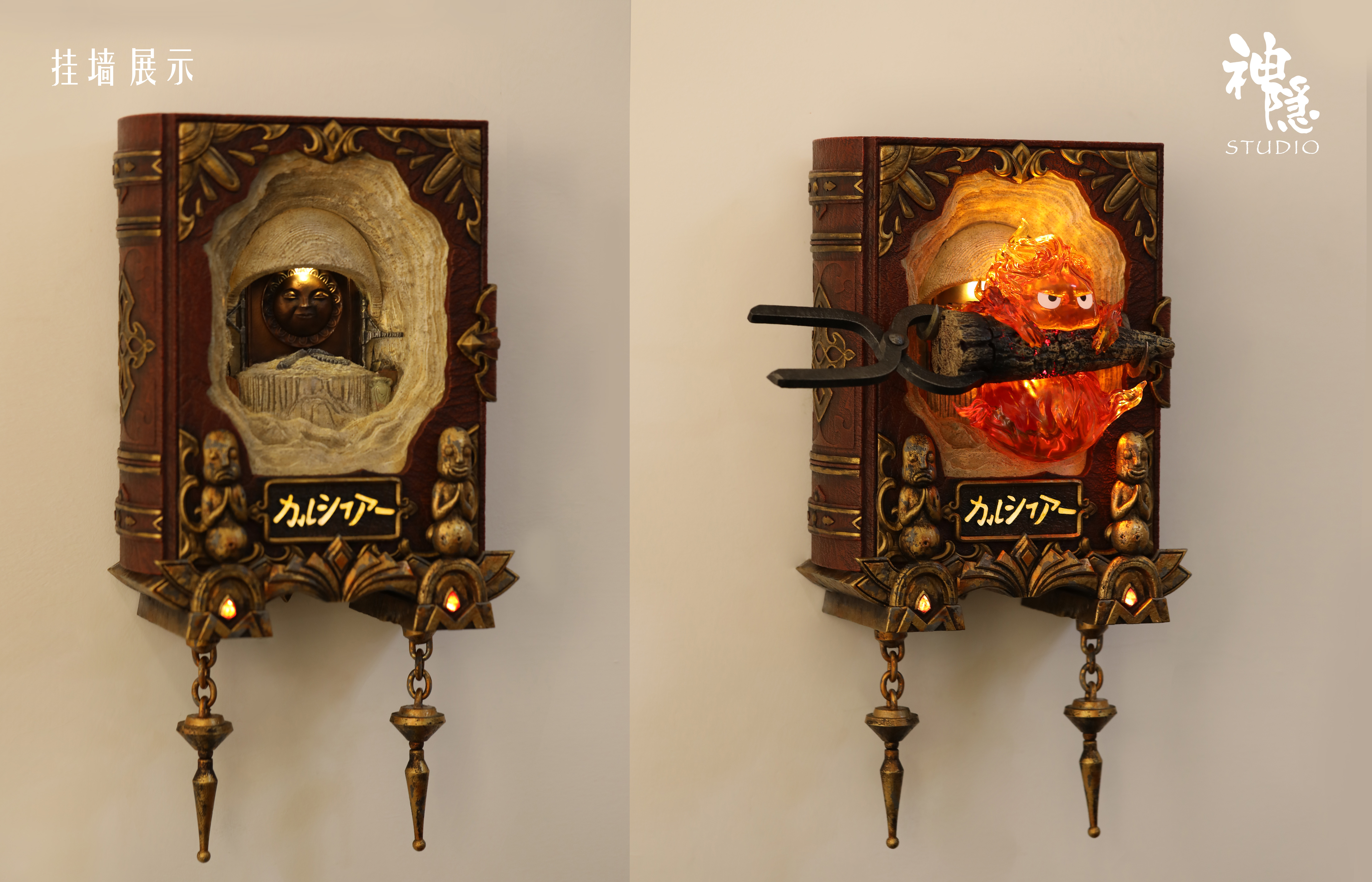 ▋作品配置:書本*1+煤灰架底座*1+支架*1+卡西法主體*1+替換的太陽花臉*1+支撐的掛鉤*1+左右銅人*2+左右吊墜*2