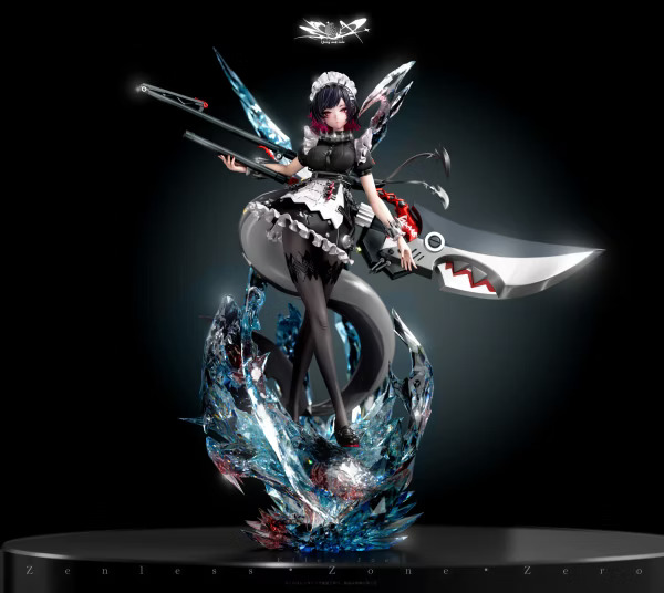 ▋作品配置:主體+裸身替換+女僕頭雕+棒棒糖學生頭雕+高精鯊魚巨刃+高透三鯊魚冰晶地台+極簡圓底座+訂製真實布料JK制服+專屬銘牌+特典電鍍鯊魚邦布